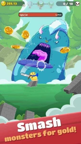 是一款放置游戏。这款的玩法超级简单,只需要点击屏幕就可以攻击BOSS,当然光靠自己的力量是不够的,你还必须通过收集黄金和招募怪物来增强自己的力量。感兴趣的话就来试试吧。