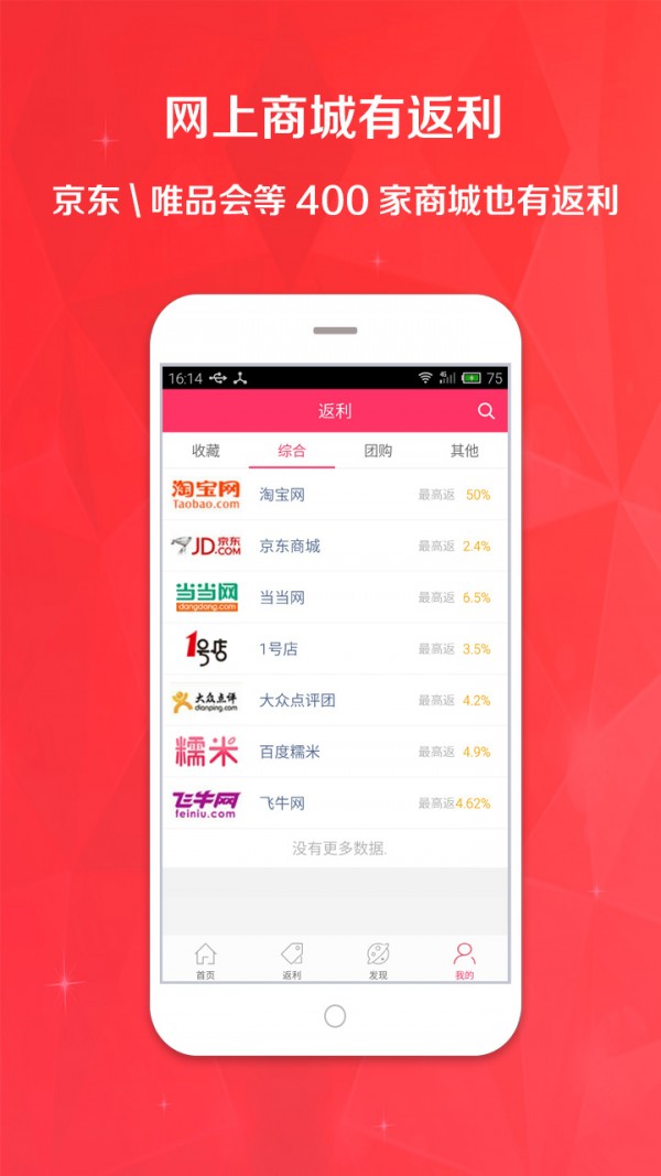 购物返利省钱神器,支持淘宝返利,天猫返利,聚划算返利及超火的九块九包邮返利,商城返利,返利高达50%,全网返利最高!支持签到奖励!提现申请24小时到账,注册使用完全免费! 最省钱:精选全网人气宝贝,返利高达50%,该省的一分钱也不能少! 最简单:常去的商城一触即达,搜宝贝更便捷,查返利更简单! 最好用:支持400多家商城购物返利,宝贝降价会提醒,随时随地拿返利!