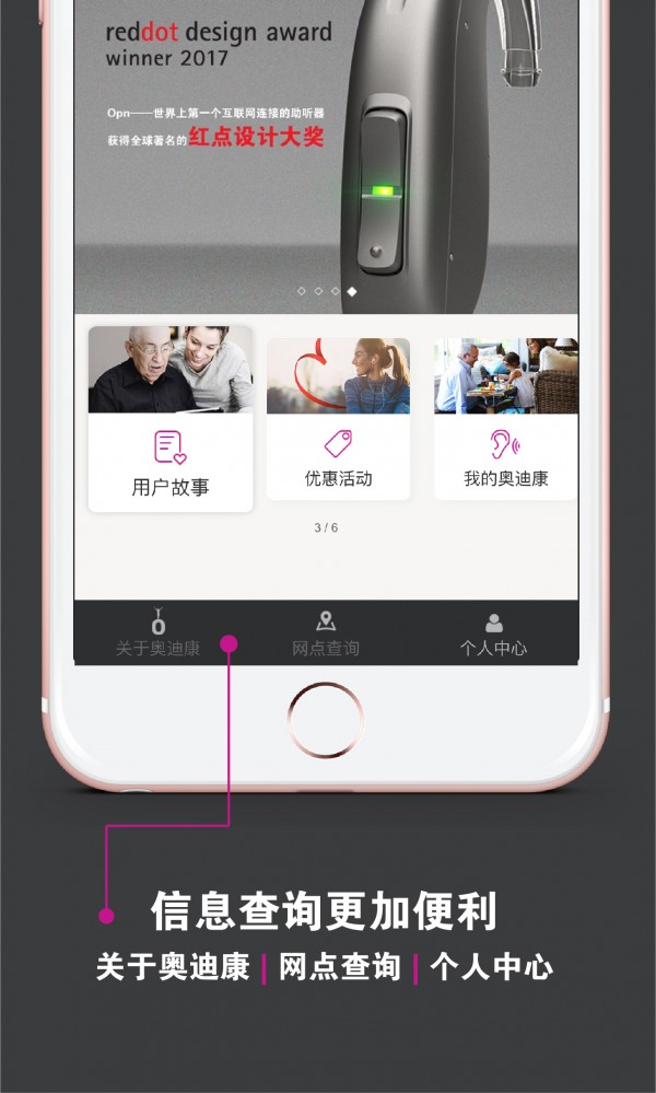 我的奥迪康app是一款为听力损失人士打造的电商平台,在这里,您不仅可以测试听力状况,学习助听器知识,了解前沿科技,更能能及时查询助听器讯息。