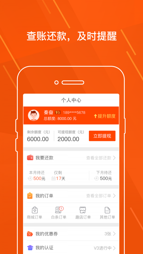 app提供分期购物、现金消费、一秒取现、趣特卖、充值等特色服务,随心分期,超低利率!app致力于为年轻人提供便捷的手机移动分期购物体验,创新、简单、快速有保障。