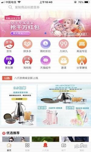 app是一款搜索各类优惠活动和海量优惠券的手机购物平台,app内有超多9.9包邮商品,限时抢购,app有着琳琅满目的特价商品,超值,超优惠,还有客服随时在线答疑。
