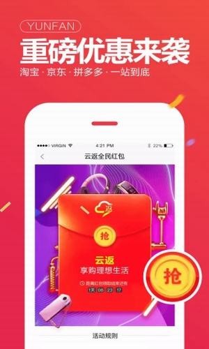 云返app是一款专为优惠购物省钱打造的网购平台,在云返app里你可以获取海量大额优惠券,云返app为您量身打造的电商生态链,如果你也想轻松省钱的话,千万不要错过哦!