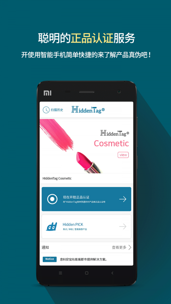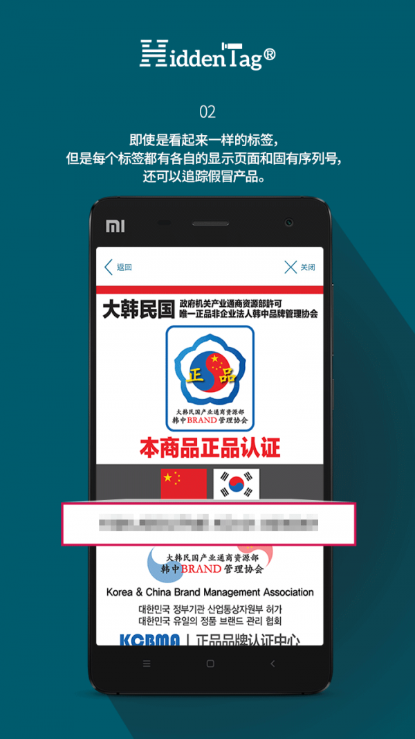 有代表性的认证服务!聪明的“HiddenTag”全息防伪。 把只有HiddenTag拥有的强力的防伪技术与水印技术相结合的智能移动机能。
