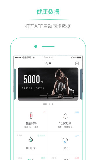 支持微信运动与QQ健康,绑定微信与QQ后即可实现每天的步数自动上传与好友PK;可以分享您的步数、卡路里和运动距离等运动数据到苹果健康