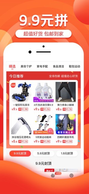 9.9元拼:每天精选百余款好货,覆盖食品、母婴、服饰、家居、数码等十多种品类。9.9元封顶!超高性价比!更享包邮到家福利~