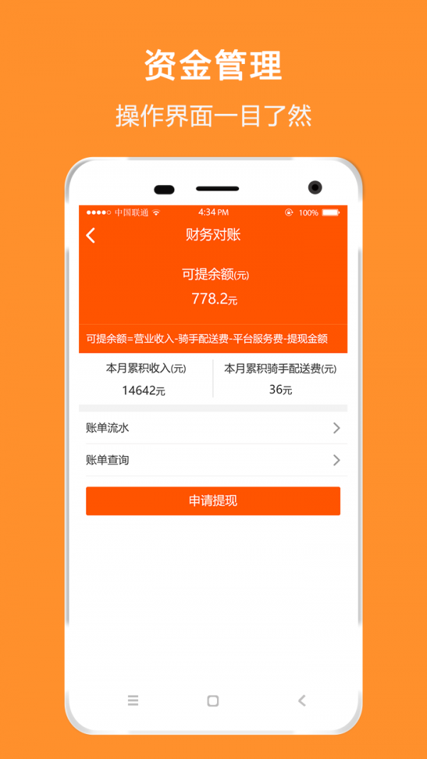 【账单结算】支持在线结算,在线申请提现,简单明了