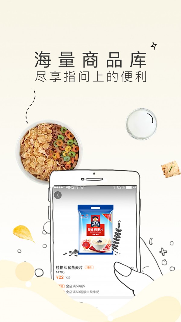 2、一键购物——海量生活用品及零食饮料等商品随时随地随心购,1小时闪电到家!