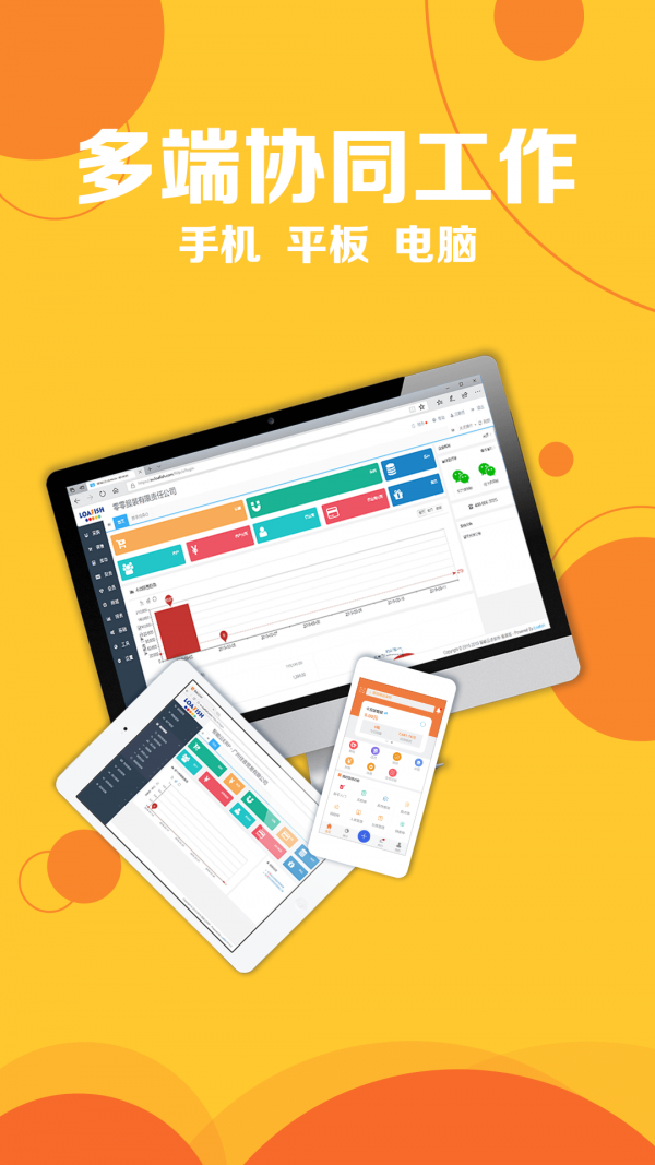 ,三屏合一,PC端、平板端、手机端都可以便捷的访问,UI完美适配不同尺寸的屏幕。满足了企业移动化办公、异地办公的需要。是装在口袋里的生意管家!