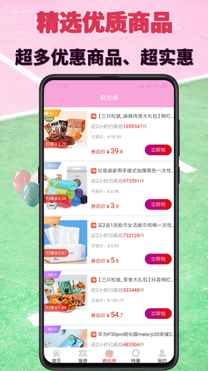 app是一款综合淘宝、天猫、京东、拼多多优惠券的app,每天人工精选上万款优质产品,让您花更少的钱,买到更好的产品。用省下的钱再购物。购物不仅省钱,还能赚钱,自购赚钱、分享赚钱、推荐赚钱等多种赚钱方式,让您赚不停。