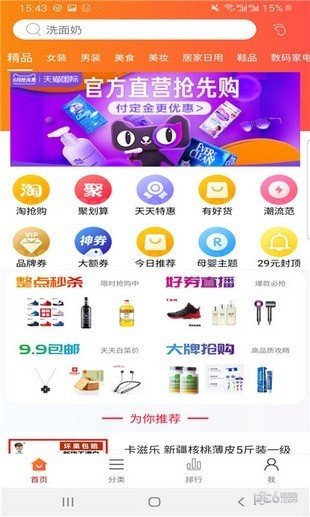 3、品牌热卖,每天上百款天猫品牌商品专区;知名品牌,美食,美妆,家居,配饰,数码,服装等