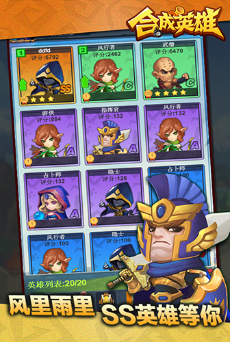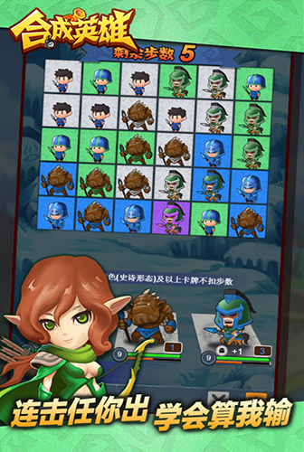 《合成英雄手游》是一款新颖又魔性的策略合成RPG游戏,画风Q萌、烧脑连击,在这款游戏中融合了消除、策略、卡牌、养成、回合RPG等多种游戏方式,总能找令你着迷的游戏玩法。不同的兵种如何搭配不同的英雄,才能发挥最大作战能力呢?快快发动你天才的大脑在这里大展身手吧!游戏操作简单,一旦上手欲罢不能!全新挑战系统,让你尖叫的ss英雄、橙装、高阶兵种都在这里!