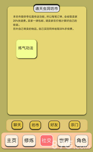 游戏中的坊市目前只开放了功法交易,可以把自己学会后的多余功法放进坊市售卖,也可以赚取灵石。