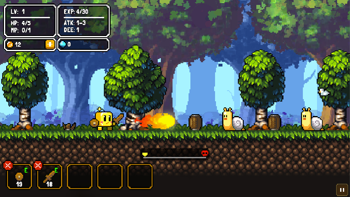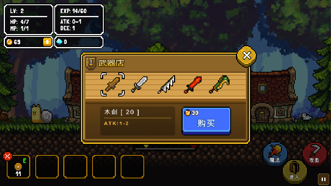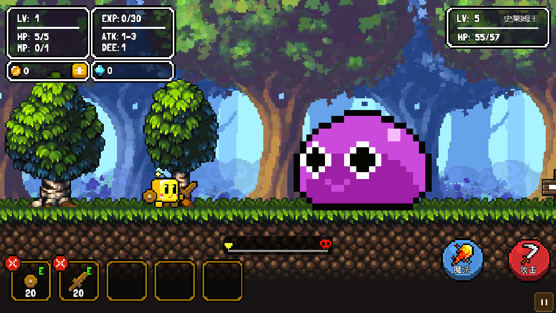 勇往直前是一款像素回合制角色扮演游戏。玩家每走一步需要谨慎,前方会遇到各种小怪物,需要你来打倒,假如错过了,也只能错过了。人生没有后悔药,没错。这就是人生!B键已扣,只许前进,不许后退。自己的每一步选择都将决定角色的成长。遇到打不过的怪物可不要勉强,会死人的!这时候逃为上策,点击逃跑按钮就可以躲过这个怪物!就这样勇往直前吧!