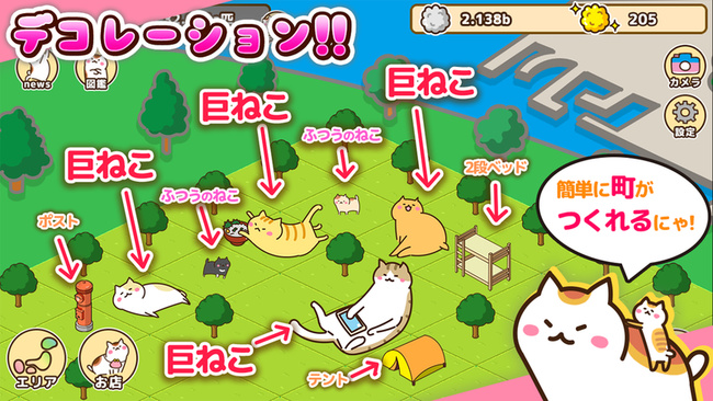 你可以在猫居住的地方创建多个具有不同特征的城镇。猫城的巨型猫咪地上有各种可爱的小猫咪,利用安置的游戏,安置的猫咪可以吸引更多的猫咪前来。