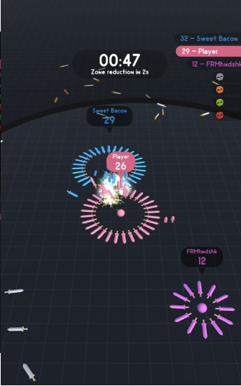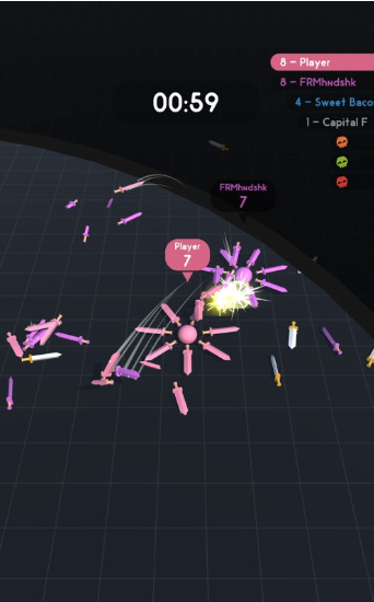 游戏玩法非常简单,持刀会收缩防御,释放可以移动攻击,灵活过渡不同玩家。每场比赛都有一个时间限制,所以抓住战斗机会尤其重要,并不断挑选分散的刀片加强自己。