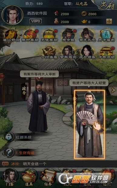 封测期间,游戏内为各位大老爷预备了满满的福利,开局送俸禄,日常送粮饷,助你一臂之力,早日升官发财。