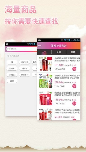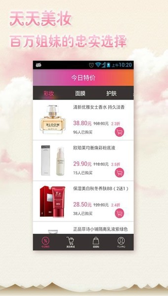 天天美妆聚划算美妆告诉您美妆百万姐妹的忠实选择美妆帮您发现超值化妆品美妆不为谁代言只为让美丽更简单天天美妆是你见过最好用的化妆品购买APP,没有之一!每日特价,限时抢购集合全网各种特价,减免,秒杀,限时特卖,赠品等促销优惠活动,超值商品一览无遗!正品保证,无需注册,方便快捷美妆买手涵盖欧美,日韩,港台,内地等众多知名品牌,涉及护肤,彩妆,香水,套装等7大类的万余种商品,所有商品直接到知名电商下单,100%正品行货.无需注册和登录,无需跳出,可直接一键下单购买.真正实现无障碍购物,化妆品比价购买第一工具!同类商品,一键比价查询美妆买手提供一键比价查询功能.通过关键字搜索,分类查询,品牌查询等多种方式查找商品,快速获取多家电商价格,送货速度,运费,缺货等信息.收藏提醒,实时获取商品动态收藏心意商品,实时获取所关注商品的动态,获知商品的最新价格动向.天天美妆,拥有之后一秒变女神!让你变美的神器,让你无法抗拒的美丽!
