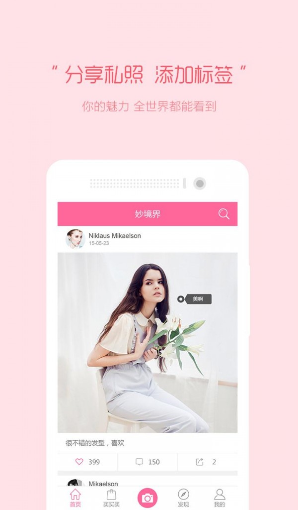 【妙境界】:图片+标签,晒出美美哒图片【买买买】:爱美的你可以在此购买心仪的发饰品【发现】:在此你可以找到志同道合的朋友,并可以选择自己喜欢的门店和造型师,根据自己的时间点去匹配心仪造型师的时间点,减少等待的时间