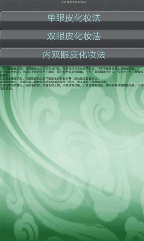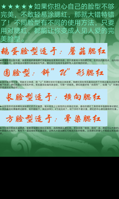最实用变身秘籍,零基础打造完美女人。不会化妆?不用怕,根据体式,很快你就会找到适合自己的妆容,三分钟实现快速彩妆。