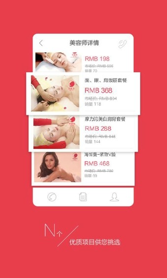 APP包揽女性需要的N大美容项目,让顶尖美容项目在手指下轻松预览。选择你喜欢的美容师,丰富优惠券随时让卡包满满。更低的成本+更优质的体验,完全透明化平台,让美容触手可及。