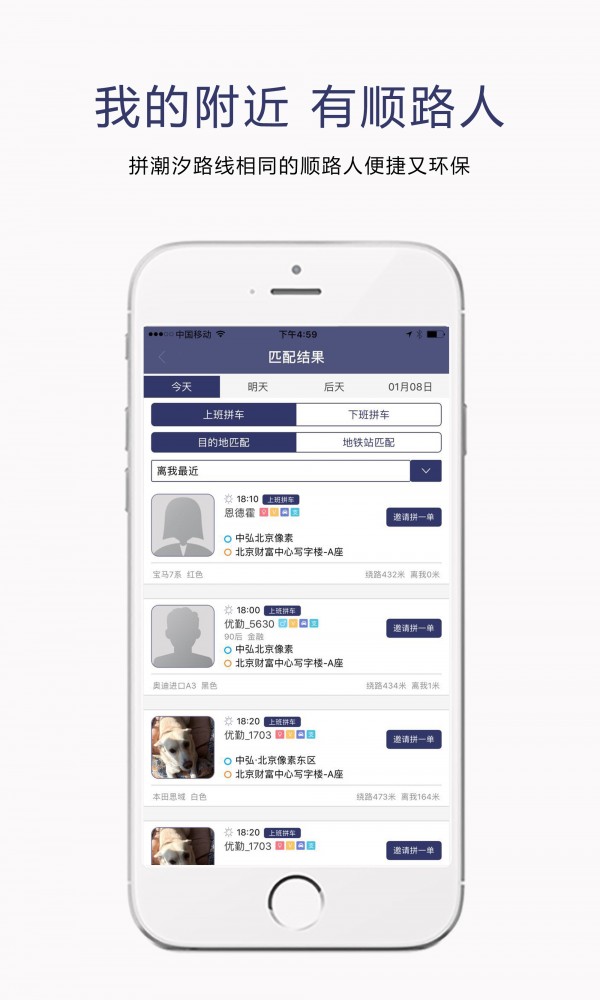 输入您的上下班路线,除全程匹配外,系统还会自动推送常用的地铁站。这样一来,您可以查看谁可以把您送达公司,如果您习惯乘坐地铁上下班,很多车主也会经过与您相同的地铁站