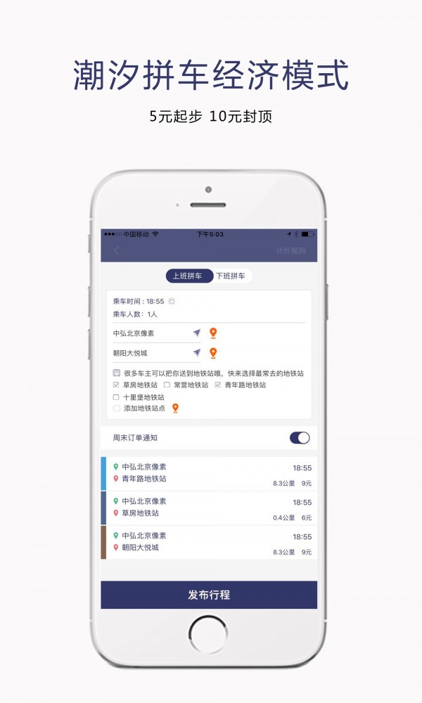 目前潮汐拼车的定价为5元起步,10元封顶(5公里以内行程计费为5元,5公里以上行程1元/公里,封顶价格为10元)