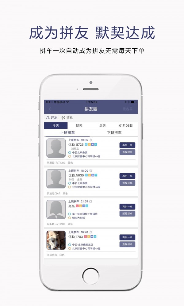 拼车一次,自动成为拼友,在拼友圈就可以找到TA,无需您每天重复下单。