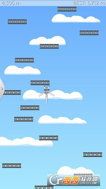 是一款玩法非常简单的闯关休闲游戏,玩家扮演一个弹簧小人,在高空云巅之间跳跃并一路往上.期间还要躲避各种障碍和怪物!游戏的挑战难度会随着游戏的发展越来越大!画面的制作非常清新简洁,操作手感十分流畅,比较考验反应力和敏捷!很适合打法无聊的碎片时间!喜欢的玩家赶快下载开始体验吧!