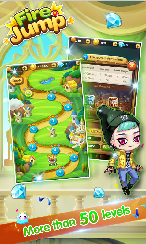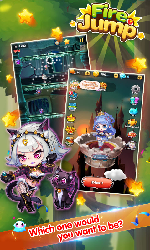 你能跳的最高,直到最上。你会发现很多不同的东西,美味的甜点,蛋,鸟类等。在消防跳跃,你将成为一个美丽的姑娘或者一个英俊的王子或者其他人。有很多层次等着你来挑战,你的目标是达到顶峰。在这个过程中,你会发现很多的困难,但不要担心。我们有很多小伙伴,可爱的精灵,可爱的猫等等。他