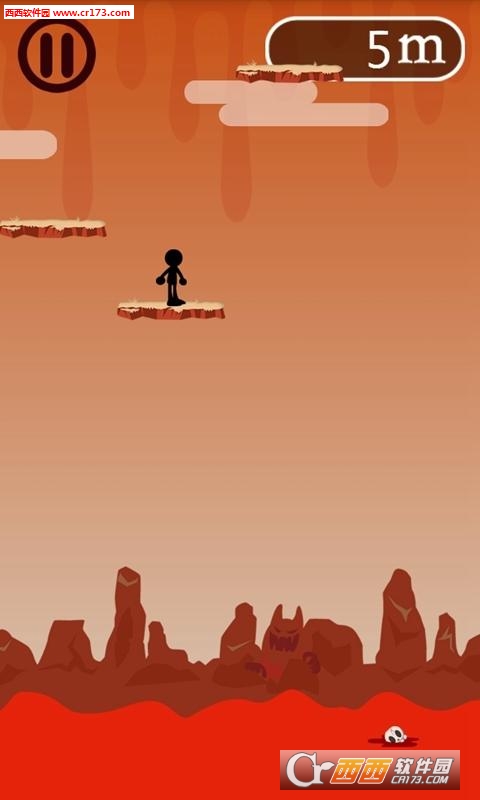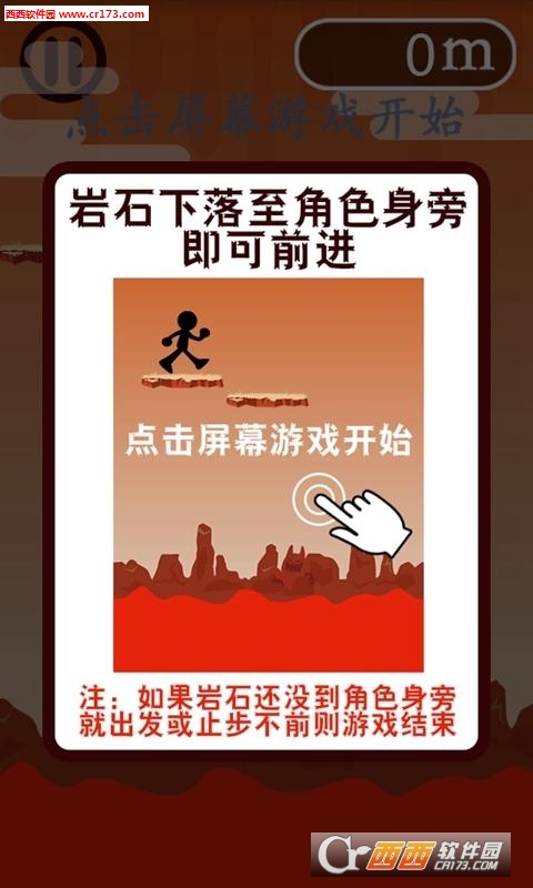 这是一款极具反应力的游戏,稍不留神就有可能掉入滚滚岩浆当中。玩家需怀着忐忑的心慢慢前进的哦。玩法其实很简单,当岩石下落到你脚下的时候,瞬间点击屏幕确定下岩石的位置,然后前进。游戏中切要注意如果岩石还没到你身旁你就出发或是一直不前进,你也是会歇菜的哦。所以找准时机很重要哦。