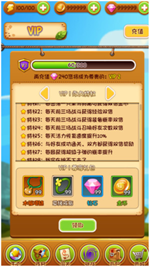 游戏中的VIP有非常多的福利,不仅能领取VIP大礼包,还可以在成为VIP1时就获得关卡扫荡10次的超快捷福利。并且更有额外购买体力次数、关卡次数,双倍月签,专属头像,额外点金次数等多项福利。所以在初期购买VIP可以让你更快的领先他人一步。