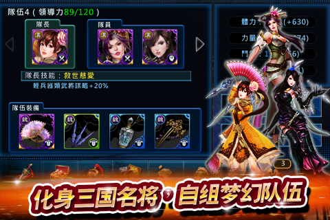 ★化身三国武将、自组梦幻队伍。透过关卡收集及游戏内机制,玩家可以收集三国名将于麾下。?可以邀请好友入队一同参战,梦幻队伍由你创造。?驰骋沙场三国名将为你争战,组成你的精英团队!