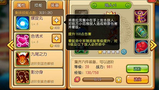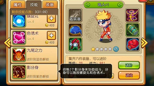 螺旋丸不必提,可晕可群攻;色诱术绝对是让对面敌人气到七窍生烟的技能,瘫痪对方战力;九尾之力供你无尽能量,招招致命绝对可怕;影分身简直bug,多几个鸣人让对方直接关机!