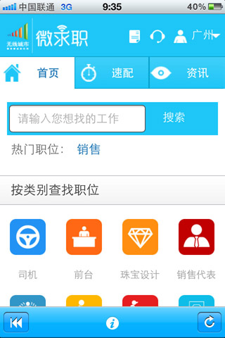 无线城市微求职,是中国移动针对IT行业、服务业、工程技术、学生等各行业求职者人群推出的手机招聘服务,企业可以通过手机发布招聘信息、宣传企业形象、搜索专业人才,企业也可以自行通过网络或手机进行简历浏览,如看到适合的应聘人员也可直接通过网络或手机进行面试邀请,该邀请会通过短信、邮件同时进行传递,真正实现招聘企业与求职者之间无线连通,使得招聘工作也可以随时随地不受网络限制地进行!而个人用户则可以通过手机,随时随地进行简历创建和投递、职位搜索等。服务平台在收到求职者投递简历后的第一时间,会自动发送邮件和短信给需求企业的HR。无线城市微求职具有以下特点:- 手机找工作:企业和求职者的无线直通车微求职针对广大求职者人群电脑上网不方便的难题,在国内率先推出基于手机的招聘服务,大大便捷了求职者找工作的需求,通过手机进行简历维护,职位搜索和投递,一旦有应聘者投递简历,马上邮件和短信提醒企业HR,企业也可以通过手机进行简历浏览,如看到适合的人才可马上进行面试邀请,邀请通知短信、邮件同时送达,企业与应聘者之间无线连通,招聘也可以随时随地!- 一句话简历:写简历和写短信一样简单对于一般的求职者群体,传统招聘网站针对白领为主的简历过于繁复难以下手,微简历只需要简单一句话简述个人情况即可生成,会写短信就能够维护微简历,求职过程大大简化。- 工作来找你:最新职位每天推送到手机微求职免费根据订阅条件,每天向求职者的手机推送最新职位信息,让求职者随时随地可了解到最快最新的好工作,找工作快人一步。软吧