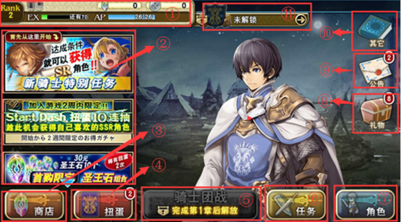 ②滚动条幅:包括新骑士特别任务、邀请限定、新章节预告以及各类活动均可从此处进入。