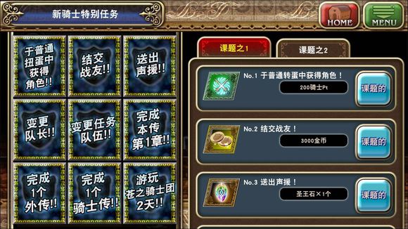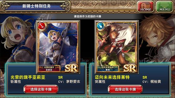 新手玩家在游戏前期经常会遇到两个难题,一是感觉到自己的卡牌不够强力,二是不知道应该做些什么。针对这一情况,我们为大家提供了【新骑士特别任务】.当玩家开启这一任务时,就可以选择下图任一卡牌作为奖励。