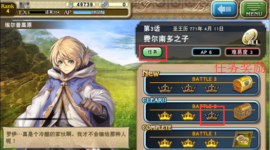 任务关卡界面会有详细的解释,如果有没有发亮的皇冠,点击中间的绿色皇冠就会有提示,你没有获得奖励的原因。游戏中主线任务的需求一般这三样:全员生还、短时间回合胜利、使用技能达成最后一击。