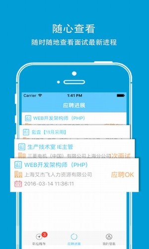 1、职位推荐列表:您的担当和系统的大数据推荐最适合求职者的职位。2、进度一览:随时随地查看应聘进展。3、我的:可修改个人信息,并可随时邮件或电话联系您的担当。4、面试地址导航:贴心的地图导航为您的面试保驾护航。5、编辑微简历:实时更新自己的简历有便于我们团地的专业咨询顾问以及大数据系统为您推荐最适合的职位哦。