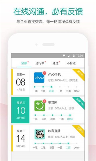 致力于打造大学毕业生实习求职第一门户,专注于为应届生提供全量校招信息、宣讲会信息,以覆盖全国校招信息、全部雇主品牌为第一个服务目标。提供在线性格测试、能力测试、实时雇主品牌沟通、在线预约面试等功能,与offer零距离。同时整理收集了面经、职场知识、简历写作指南等知识,让面试变得底气十足。还与暴走漫画、酷派、好未来、映客等大量优质雇主品牌建立了合作,努力缩短应届生与企业的最后距离。