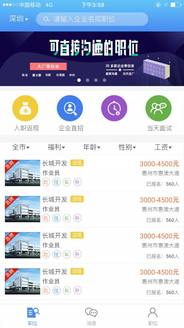 蓝领急聘app,专注普工在线招聘垂直领域,坚持“绝不收费,入职返现,拒绝被骗”的理念,为求职用户提供从在线申请到带队面试、接送入厂、住宿安排、入职后跟踪的全程服务。我们承诺,入职后即可通过app绑定银行卡返现!
