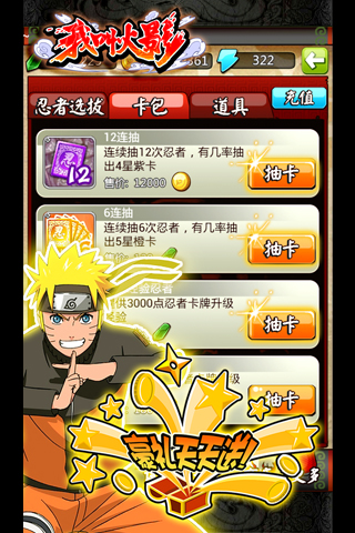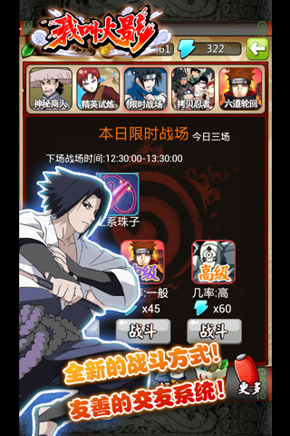 《我叫火影》是一款取材于漫画《火影忍者》的精品卡牌手游,游戏严格按照火影忍者的故事剧情进行编制,忍者星级及强弱划分也依据漫画而定。忍者人物设计、装备设计、UI设计以《火影忍者》为蓝本打造,让玩家有一种似曾相识的感觉。创新的核心战斗系统、完善的卡牌强度及忍术体系、特色主线副本及精英副本,带你重回木叶村!