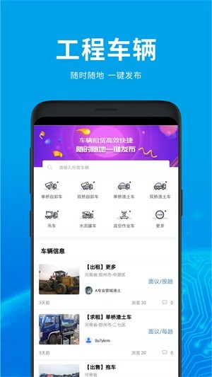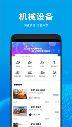 自动展示同城闲置机械、机械设备租赁高效快捷、同城/跨区实时查询、随时随地一键发布、二手机械买卖。
