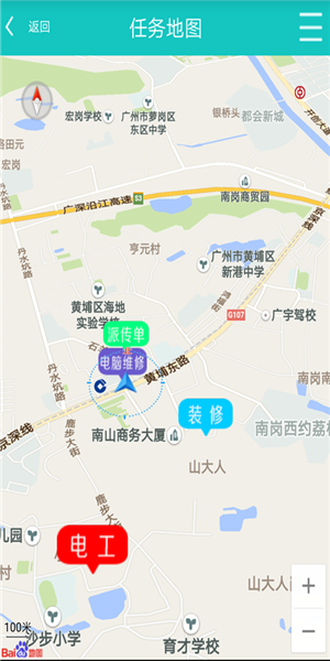 1、发布任务,发布的任务通过GPS位置技术,使师傅清楚任务的位置