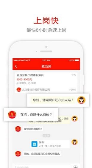 求职疑问即时解决,招聘猫让你可以即时与企业沟通,消除你的求职疑虑,求职效率高。