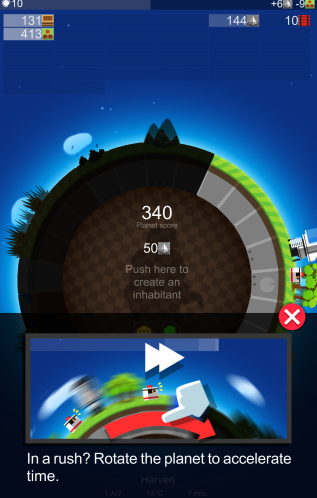 游戏的唯一的一个操作要点就是旋转星球了吧(笑),当玩家指触星球并在屏幕上画圈时,星球就会实时转动,缩短生产周期,也就是玩家可以操纵星球自转速度哦,是不是很有“神”的感觉?