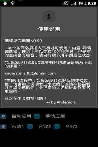 VoiceChanger(蝴蝶结变声器),一款动漫向的变声小软件。看过柯南的朋友都会想拥有像柯南一样的蝴蝶结变声器,这个程序可以满足你小小的愿望。只需录下你的声音,拨动上面的按钮,就可以实现声音频率的改变。
