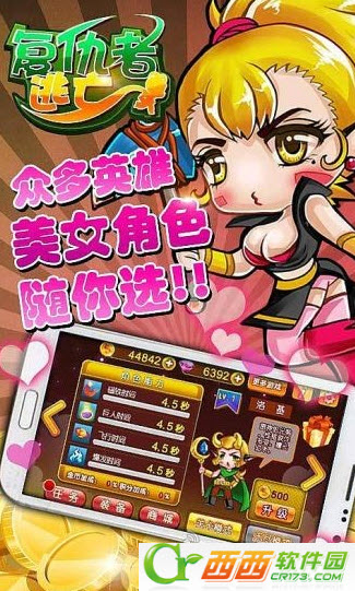 复仇者逃亡是一款动作类敏捷游戏。游戏整个情节的发展有点像某个酷跑游戏哦,在人物的方面你能看见那一个个很萌很霸道的样子,那水汪汪的眼睛瞬间就将你的整个心所虏获,有好几种角色给你选择,当你的钱数够的话还能买到更高级的装备哦。