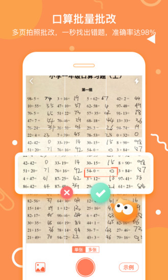 口算批量批改:多页拍照批改,一秒找出错题,准确率达98%。