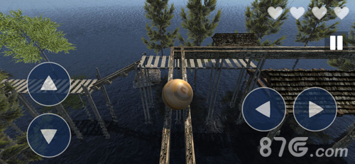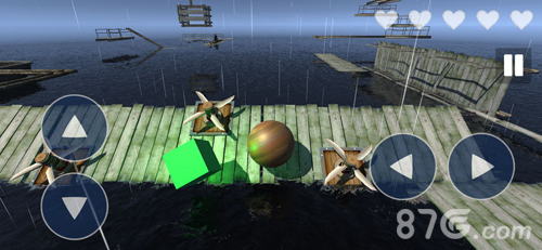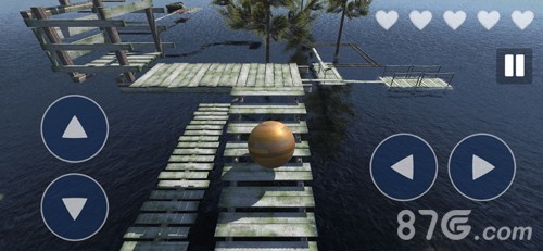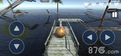 整个环境周围都充满了水,玩家们必须通过避开障碍物来平衡木桥上的球,并且在球没有落水的情况下抵达终点;