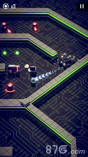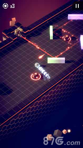 2、充满科幻色彩的场景,小球在前进时还有炫酷的拖尾哦。收集宝石引爆炸弹完成挑战吧;